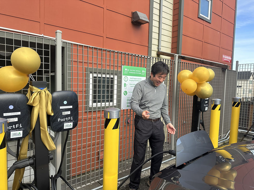At the ceremony, Winston Lee, President of United Hub, and Mara MacDonell, Program Manager at Washington State Department of Commerce, demonstrated the use of the EV charging stations.